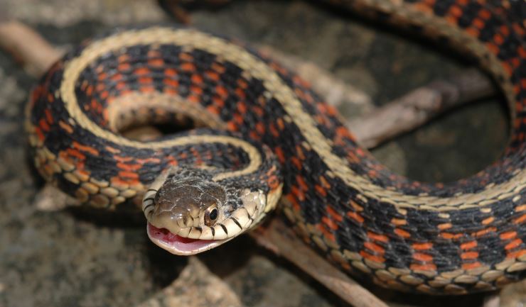De gifstof in het speeksel van de kousenbandslang is niet gevaarlijk voor mensen.