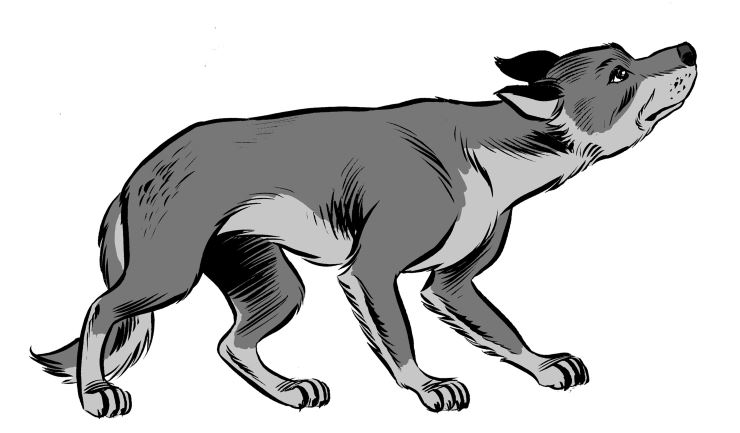 Hij staat recht op zijn poten. Zijn kop is omhoog.