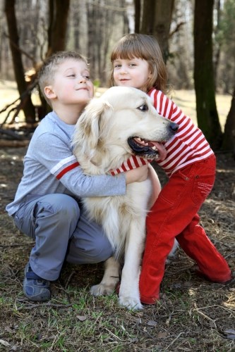 Deze kinderen knuffelen de hond. Maar kijk eens goed? Zie je dat de hond opzij kijkt, weg van de kinderen? Dat is een teken van stress. Hij hijgt en je zit het wit van zijn oog. Dat zijn ook tekens van stress. Zijn oren zijn naar achteren: hij is onzeker of een beetje bang. Deze hond vindt het helemaal niet leuk dat hij zo wordt vastgehouden! De kinderen moeten hem loslaten, want anders kan het mis gaan.
