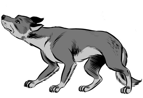 Hij zakt een klein beetje door zijn poten. Zijn kop is wat omlaag.